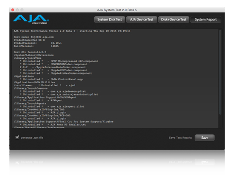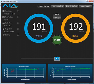 AJA System Testは、KONA、Io、T-TAP製品の市販ソフトウェアダウンロードに含まれており、ドライブのパフォーマンス統計に関する正確かつ詳細な評価を提供するために業界全体で利用されています。この情報により、ユーザーは様々な解像度やコーデックでの録画・再生におけるドライブシステムの能力を予測することができます。