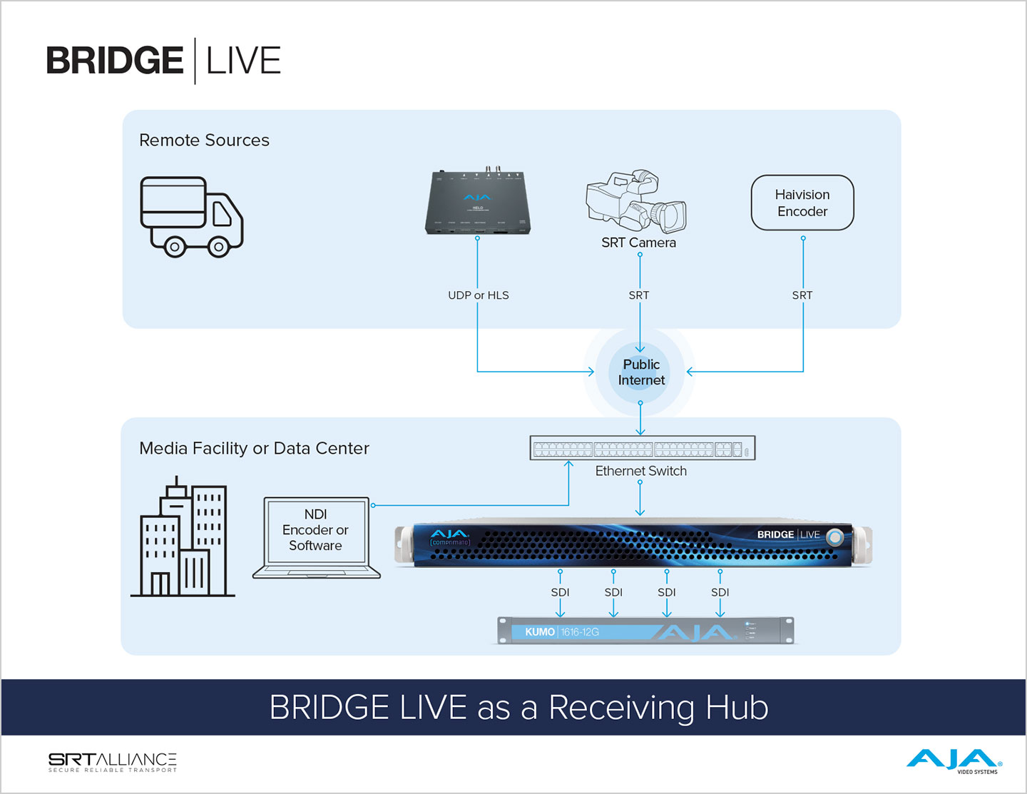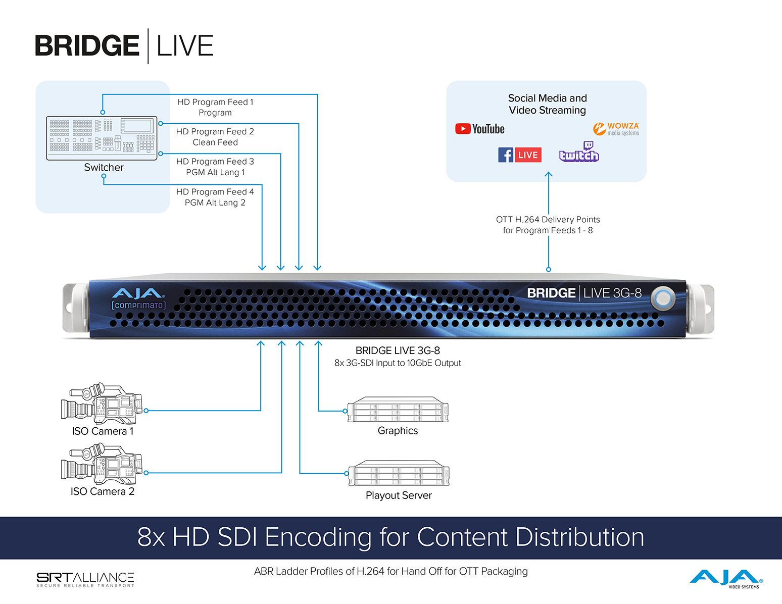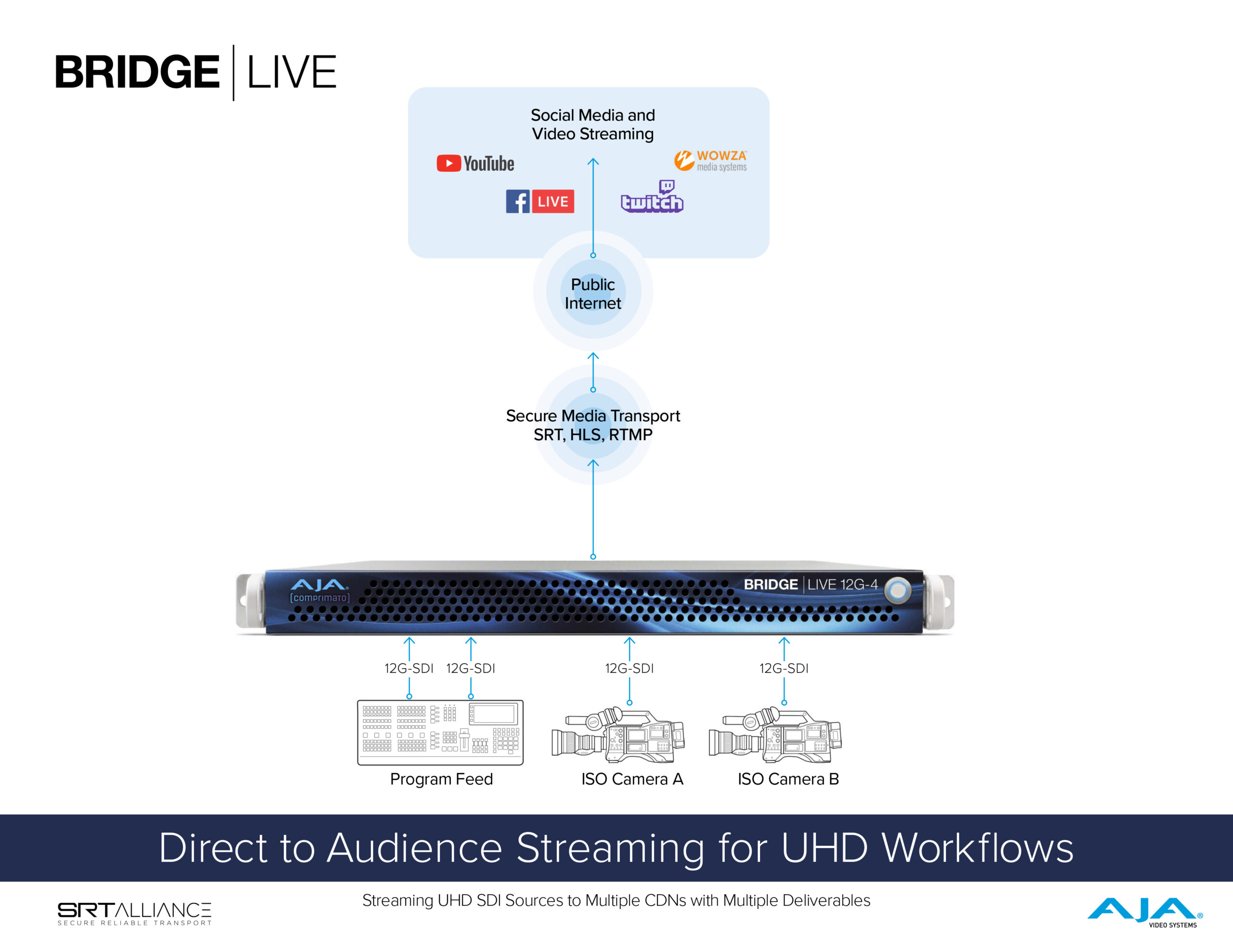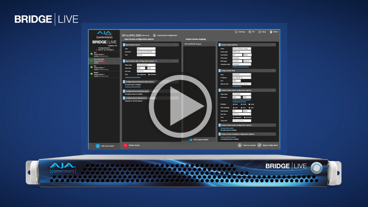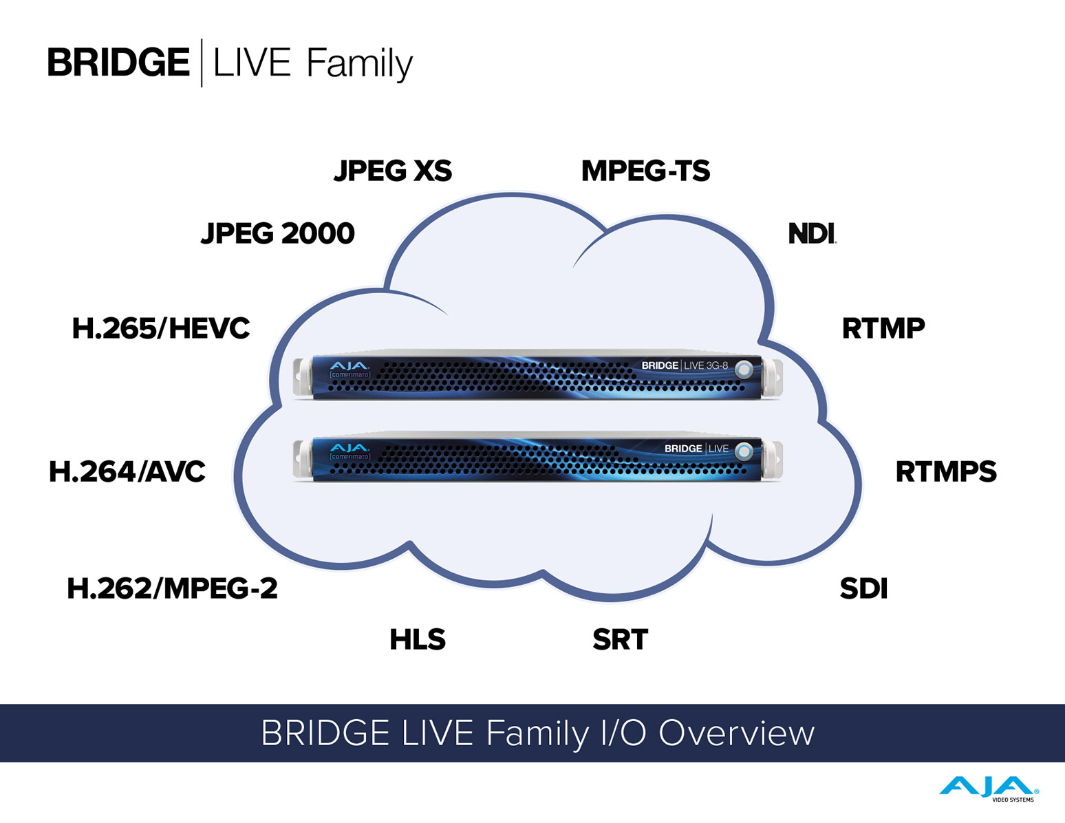 AJA ストリーミング ソリューションには、最新のストリーミング ソフトウェア、コーデック、フォーマット、トランスポート プロトコル、配信プラットフォームをサポートするスタンドアロンおよびモジュラー I/O デバイスが含まれています。