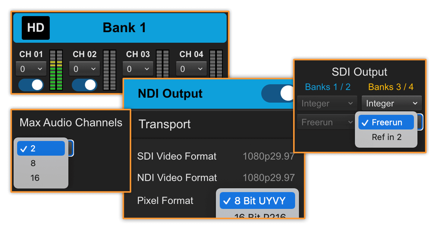 • ビデオ/キーペア(2x SDI から 1x NDI + Alpha、または 1x NDI + Alpha から 2x SDI)