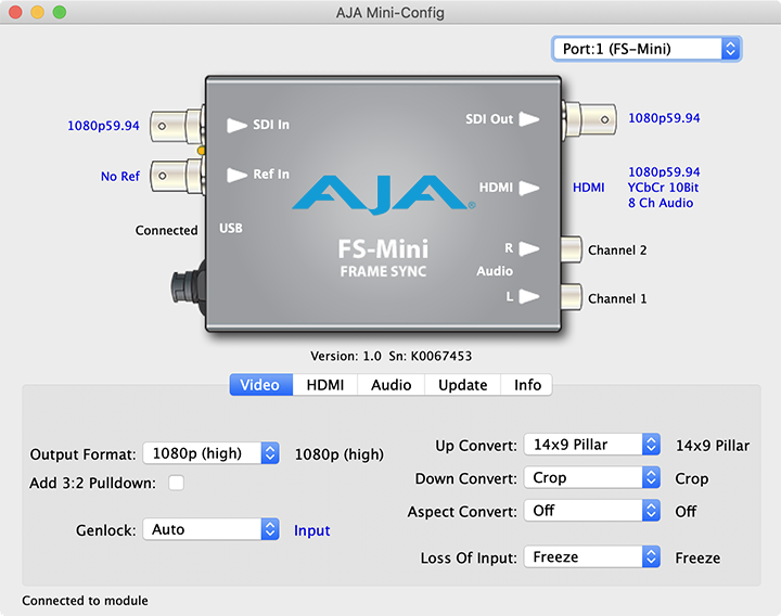 本機は、ローカルリファレンスにロックするためのリファレンス入力も備えています。ローカルDIPスイッチまたはAJAのMini-Configアプリケーションを使用したUSB経由で簡単に制御できます。