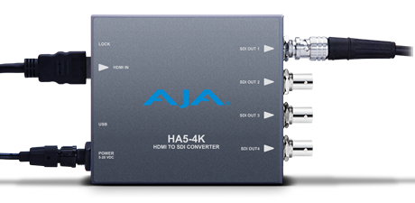 AJAのHA5-4Kミニコンバータは、4系統の3G SDI出力を備え、HDMIから4K SDIへの高品質な変換を実現します。HA5-4Kは、DSLR、ミラーレスカメラ、アクションカメラ、プロシューマー向け4KビデオカメラからのHDMIビデオを4K SDIに変換し、プロフェッショナルワークフローで活用できます。また、AJA Mini-Configソフトウェアと併用することで、HDMI経由で入力されるHDRインフォフレームデータの解析も可能です。