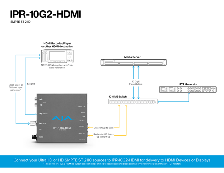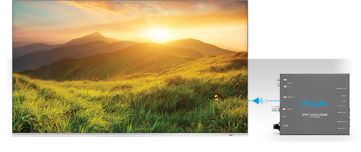 IPR-10G2-HDMI ミニコンバータは、SMPTE ST 2110 ネットワークを HDMI にブリッジするように設計されており、最大 UHD 50p または HD 60p をサポートします。