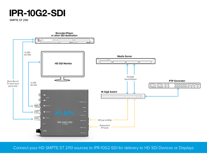 IPR-10G2-SDI ミニコンバータは、SMPTE ST 2110 ネットワークを SDI にブリッジするように設計されており、最大 HD 60p をサポートします。