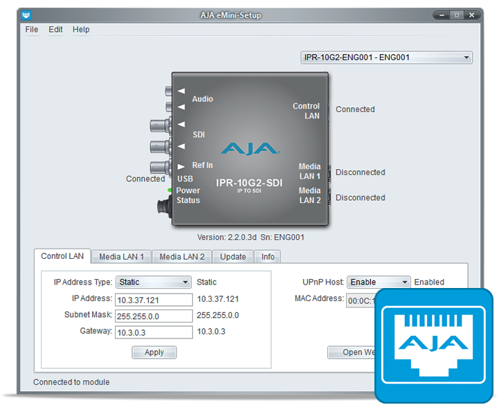 • AJA eMini-Setup は、ローカルデスクトップコンピュータ経由のネットワークセットアップと構成をサポートします。