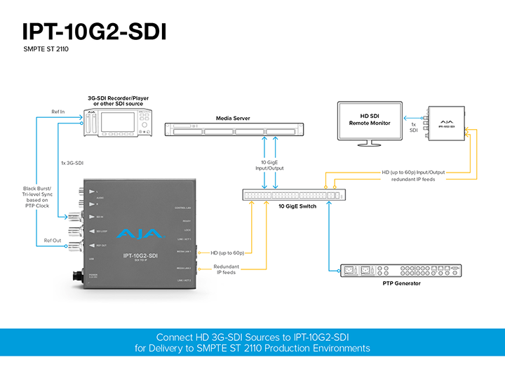 IPT-10G2-SDI は、3G-SDI ビデオ ソースを SMPTE ST 2110 ネットワークにブリッジするように設計されています。