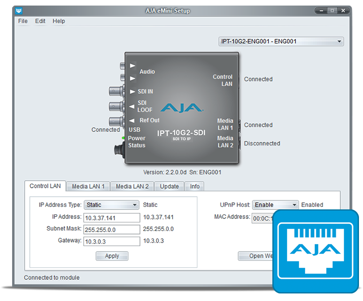 • AJA eMini-Setup は、ローカルデスクトップコンピュータ経由のネットワークセットアップと構成をサポートします。