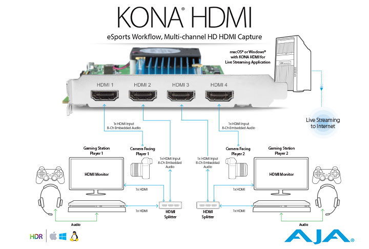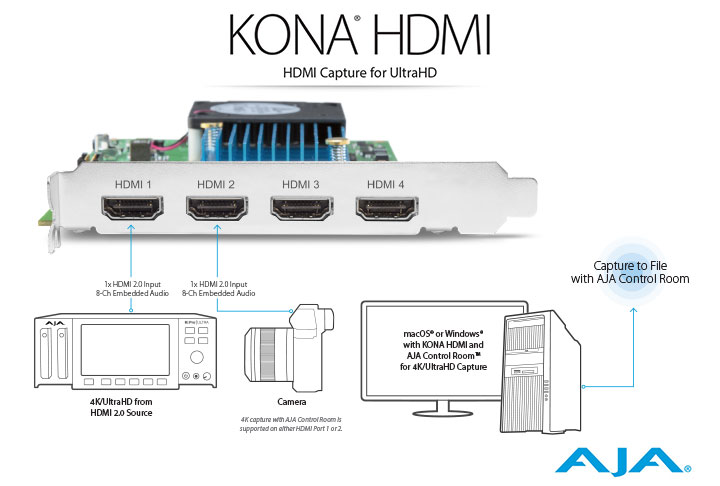 KONA HDMI は、AJA SDK と Video for Linux® の両方でサポートされているため、マルチチャンネル HDMI 取り込み、スイッチング、監視、通信ソリューションの開発者にとって最適な選択肢となります。