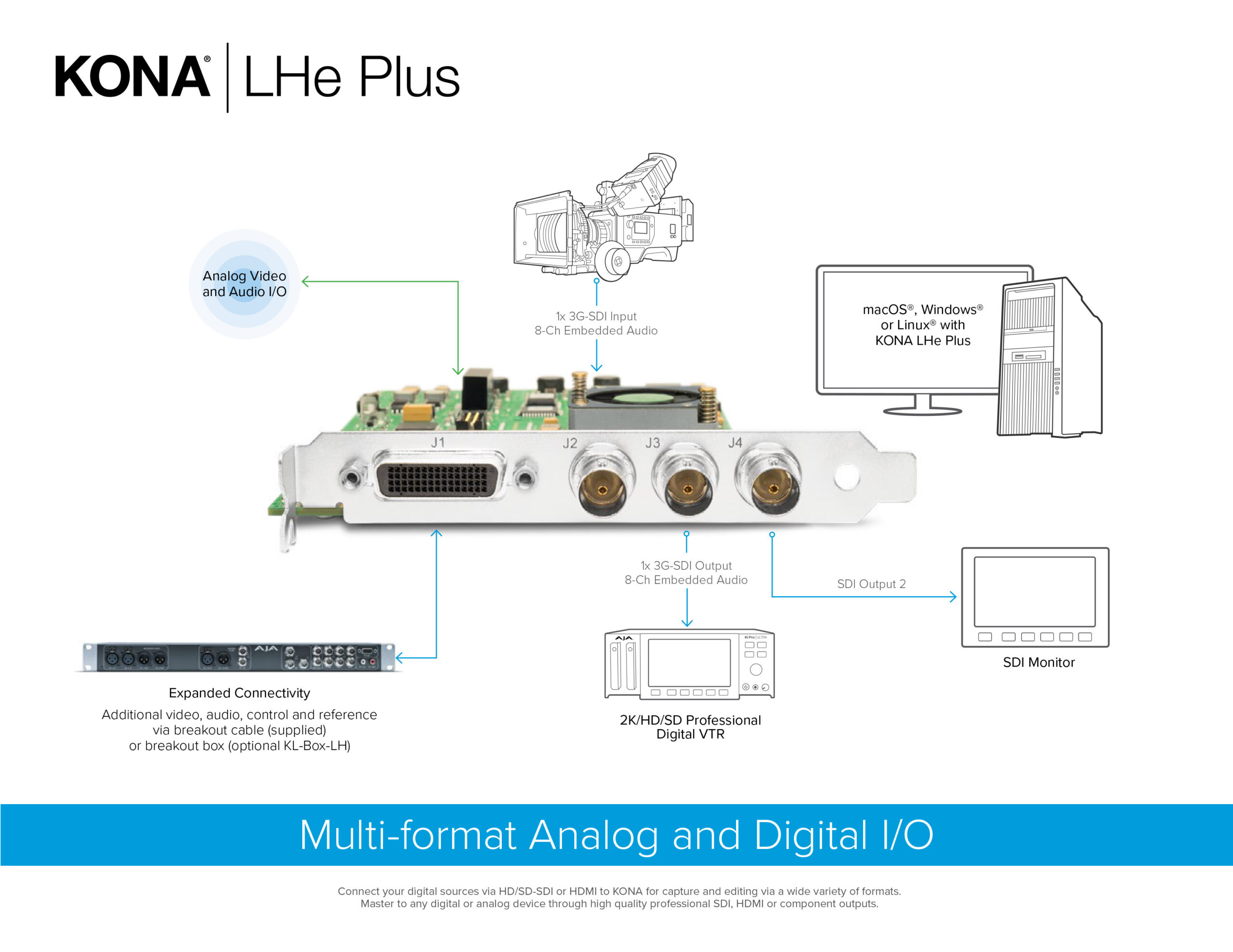 コンポジット、コンポーネント、3G-SDI、HDMI から放送用 IP まで、AJA のデスクトップソリューションはあらゆるプロジェクトに必要な入出力を提供します。詳細は KONA デスクトップ I/O ファミリーをご覧ください。