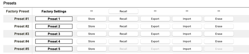 この強力な機能は、現在の設定を20個のプリセットスロットの1つに保存します。設定ページでの設定はプリセットに保存され、いつでも呼び出してKUMOを以前の状態に戻すことができます。プリセットに保存される項目は以下のとおりです。