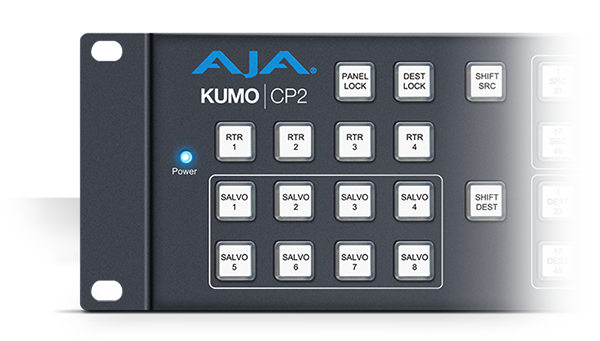 KUMO CP2は、KUMO 6464を含むすべてのKUMOルーターに適した、スタンドアローン構成またはネットワーク構成で使用できる2RUコントロールパネルです。KUMOルーターと同じネットワークにイーサネット経由で接続することで、コンピューターを必要とせず、どこからでも完全な制御が可能になります。1台のコントロールパネルから最大4台のKUMOルーターを制御できます。デュアルポートおよびクアッドポートの連動ルーティング制御をサポートし、複数の入出力をグループ化して、デュアルリンク、クアッドリンク4K/UHD、8K/UHD2ワークフローに対応します。