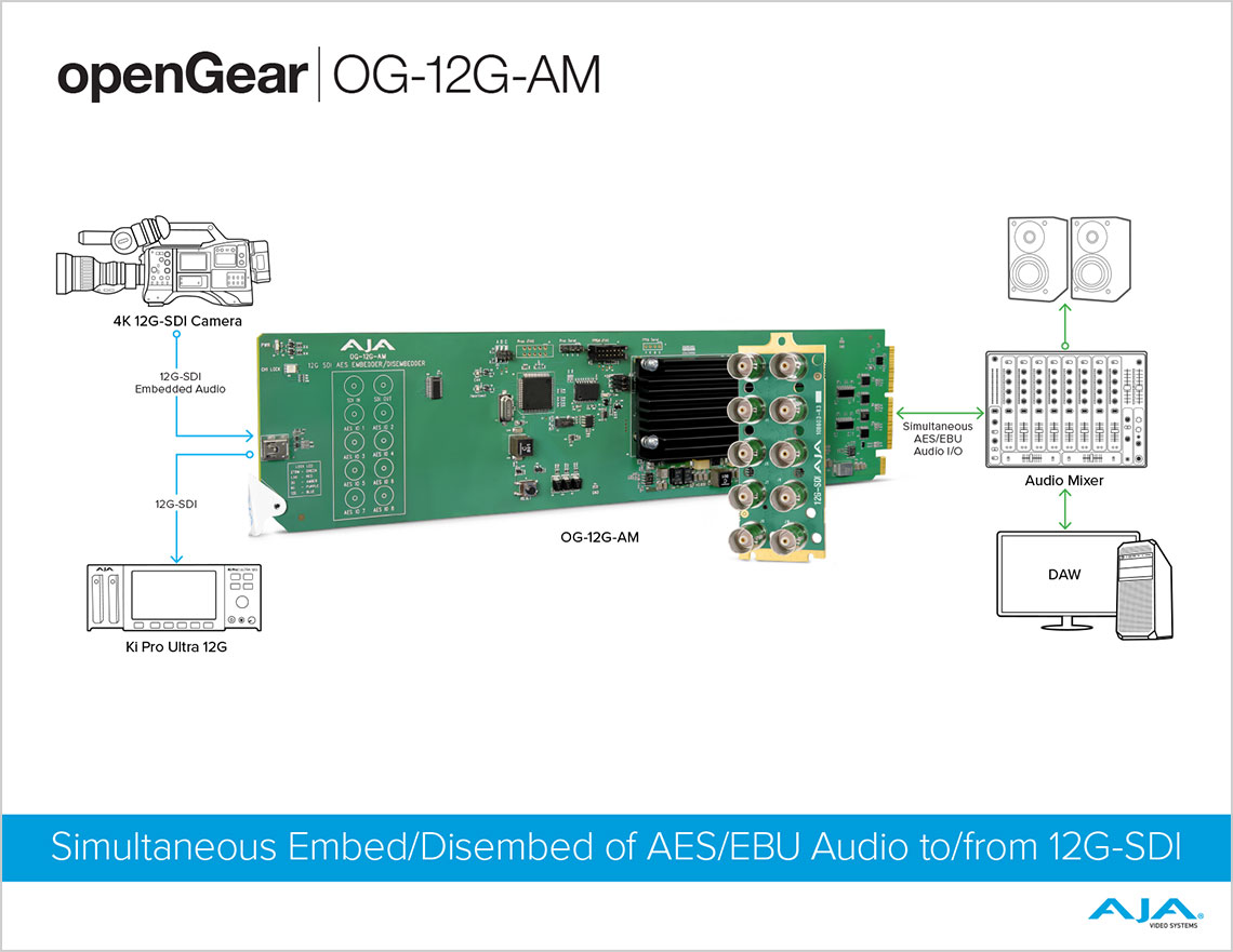 OG-12G-AM は、12G-SDI 入力と最大 4K/UHD までの出力をサポートする 16 チャンネル AES/EBU オーディオ エンベッダー/ディスエンベッダー openGear カードです。