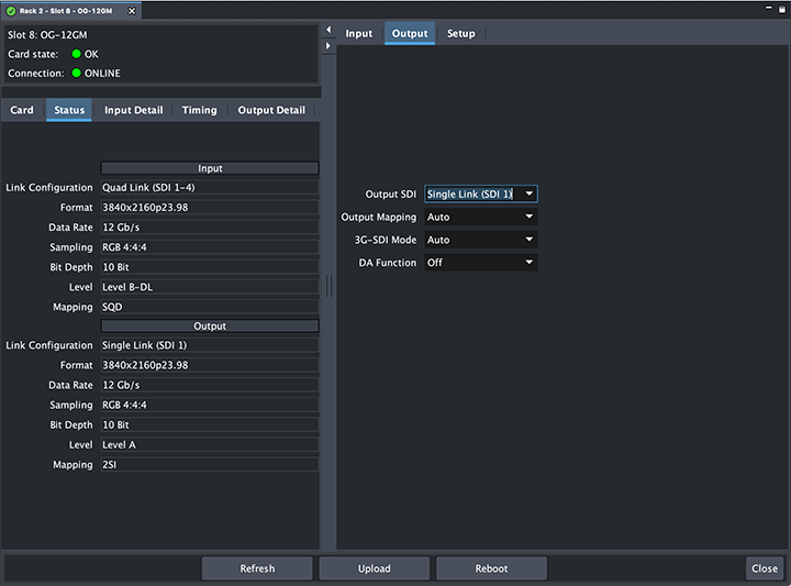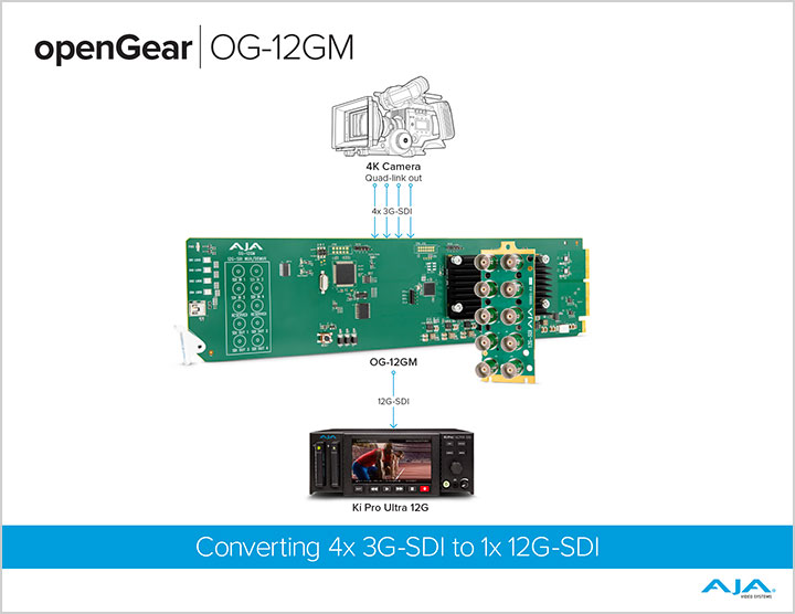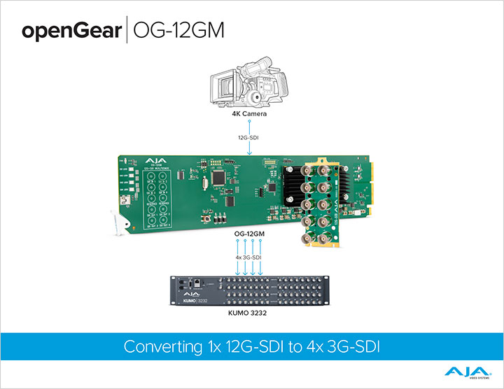 OG-12GMは、12G-SDIからクアッドリンク3G-SDI、およびクアッドリンク3G-SDIから12G-SDIへの変換を可能にするコンパクトなOpenGear SDIトランスポートカードです。マルチプレクサー/デマルチプレクサーは、4K、UHD、2K、HD、SDワークフローに対応し、クアッドリンクSDI信号からシングルリンクSDI信号への変換(およびその逆)を12G、6G、3G、1.5Gのビットレートで実行できます。また、デュアルリンクおよびデュアルストリーム変換も可能です。スクエアディビジョン(クアドラント)と2サンプルインターリーブ(2SI)の両方の入出力マッピングをサポートしています。