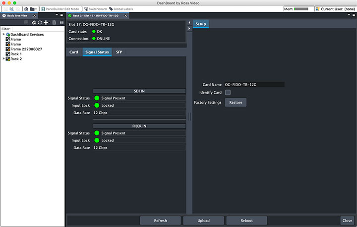 標準イーサネット接続により、Ross DashBoardソフトウェアアプリケーションを介してフレームにアクセスし、フレーム全体の通信を行うことができます。オプションで、フレームにカードごとのイーサネットアクセス機能をインストールすることで、互換性のあるopenGearカードとの高度な通信が可能になります。