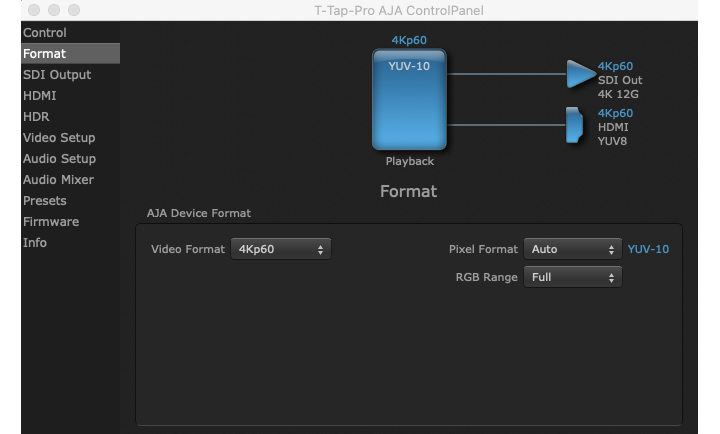 他のAJA Thunderbolt接続デバイスと同様に、モニターに出力するオーディオは付属のAJAコントロールパネルソフトウェアで選択し、オーディオ設定タブで制御します。チャンネル1と2、7と8、そして最大15と16までの任意のペアを、ワンクリックで選択してモニタリングできます。上図は、T-TAP Proの信号フローと制御オプションを示しています。