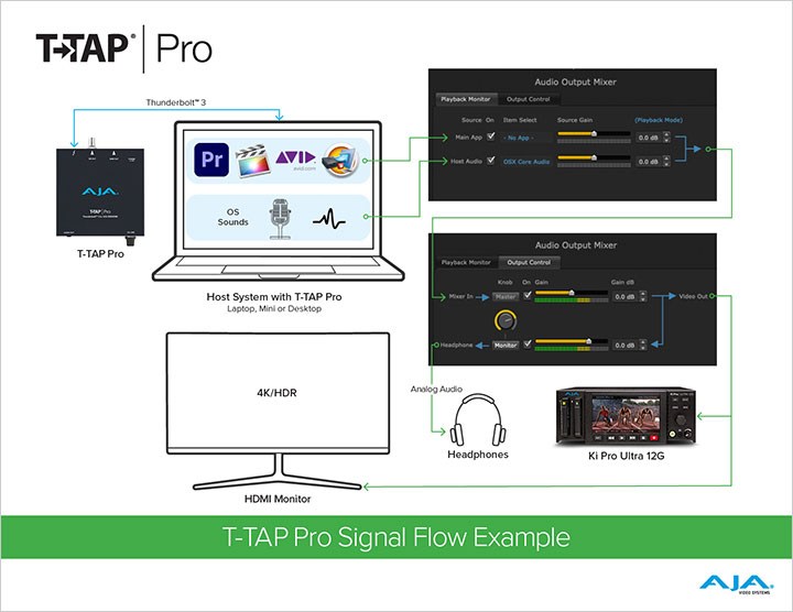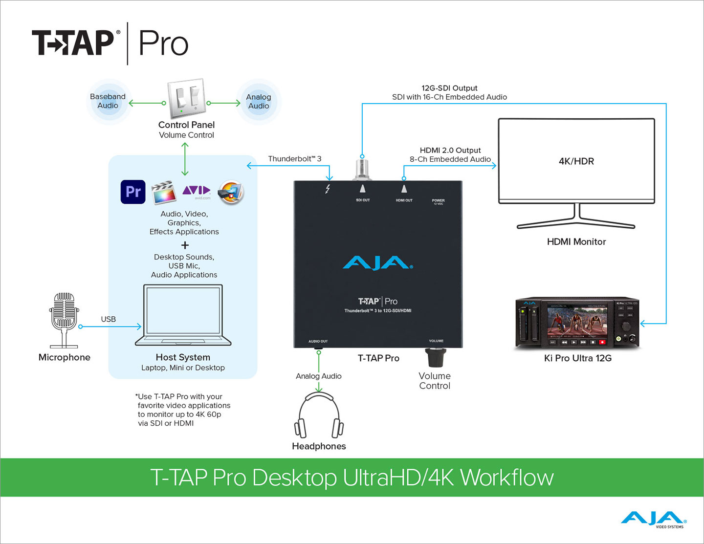 T-TAP Proは、非常に小さなフットプリントでありながら圧倒的なパワーを発揮し、静音設計によりデスクトップでの操作性を向上させています。このワークフロー例では、T-TAP Proを機能豊富なシステムの中心に据え、ホストノートPCがThunderbolt 3で両者を接続しています。幅広いソフトウェアサポートにより、T-TAP ProはNLEまたはポストプロダクションソフトウェアのタイムラインから、12G-SDI/HDMI 2.0出力を介して同時にビデオを出力できます。この図では、AJA Ki Pro Ultra 12Gデジタルビデオレコーダーと標準的な4K/HDR対応HDMIコンシューマーモニターが接続されています。ストリーミングコンテンツも強化され、編集者は適切なサードパーティ製ソフトウェアを使用することで、最大4K 60pまでの解像度で、NLEタイムライン出力を視聴者とリアルタイムで直接共有できます。
