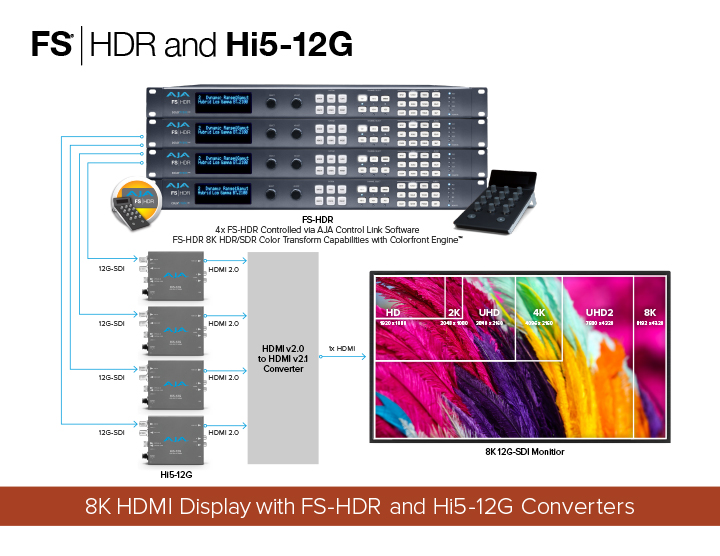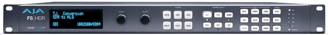 AJAのFSシリーズは、1RUサイズのフレームシンクロナイザー兼多機能コンバーターで、SDから4Kまで対応します。1〜4チャンネルのHDサポートに加え、リアルタイムHDR変換を含む高度なワークフローにも対応しており、特に高性能なFS-HDRはその代表的な製品です。
