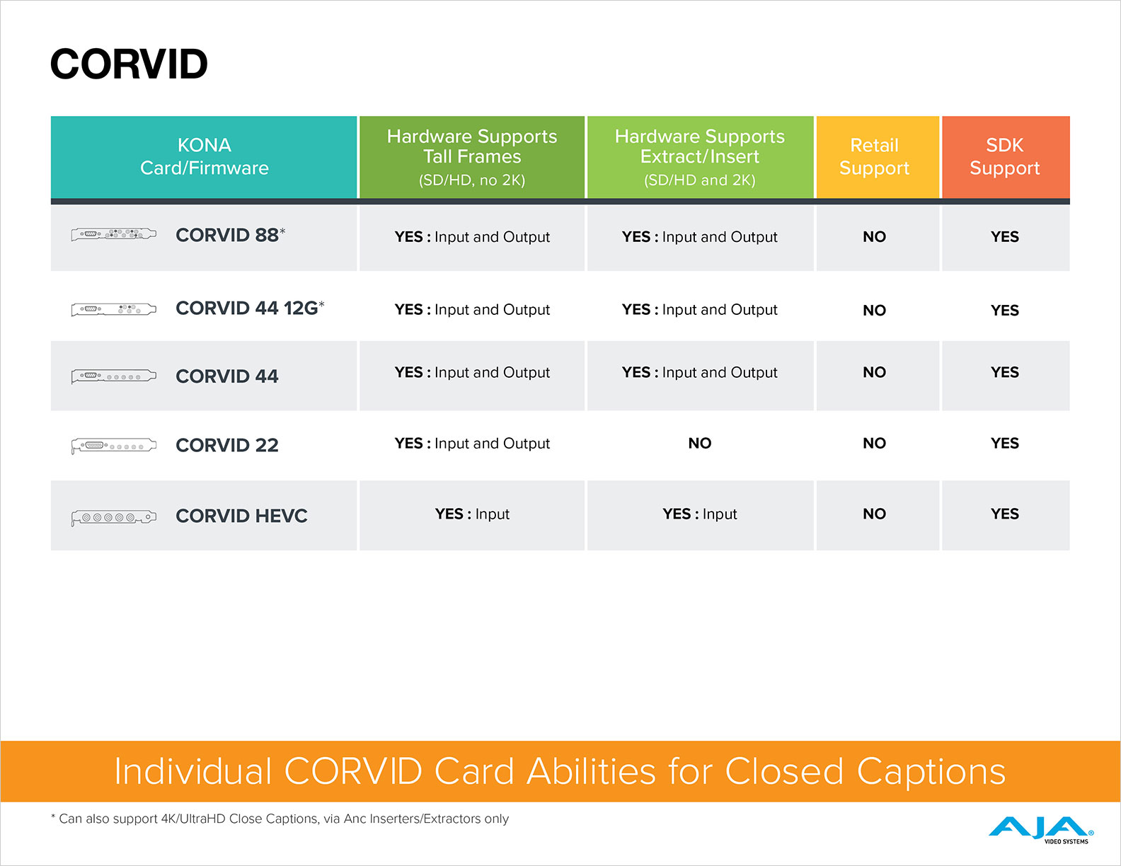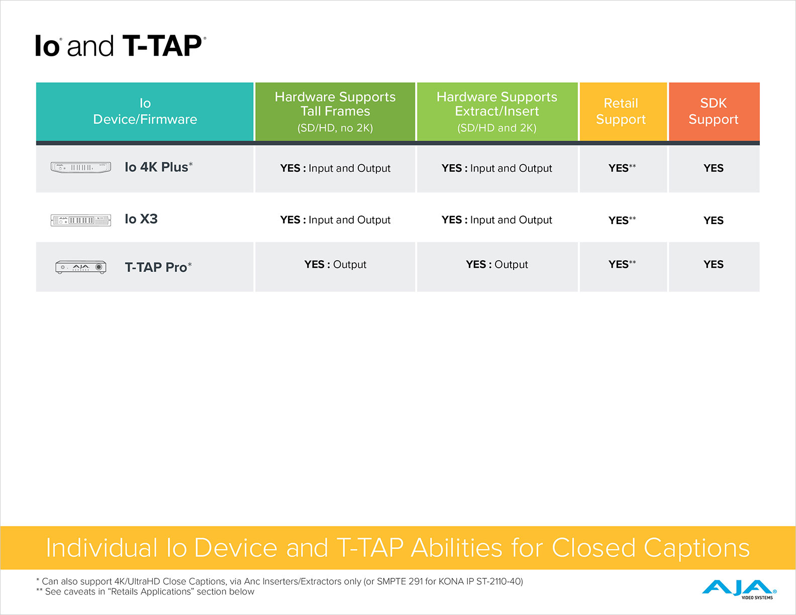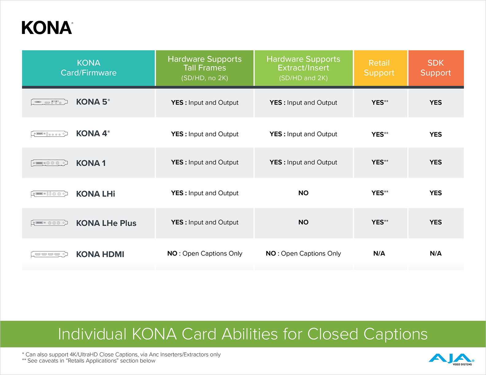 • AJA 独自のクローズドキャプションライブラリによる NTSC キャプションの追加サポート (OEM SDK のみ)