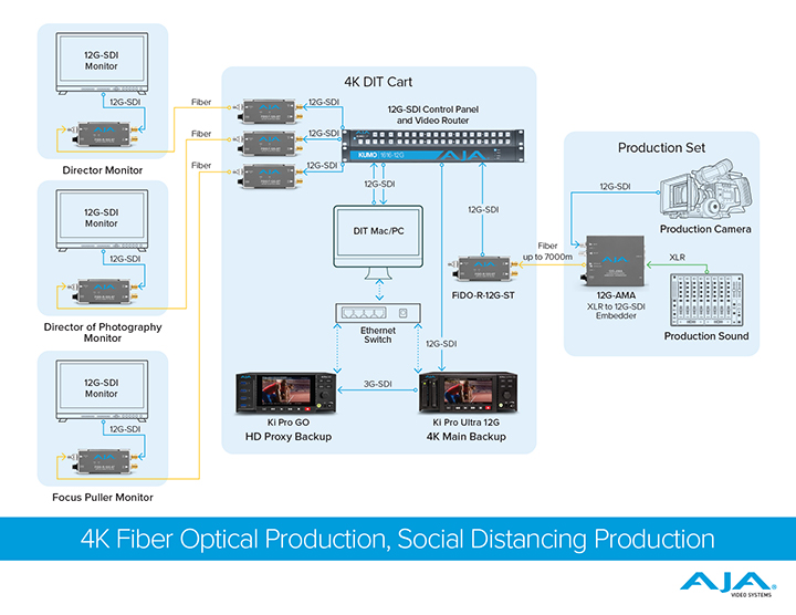 最近のCOVID-19の世界的な蔓延により、映画やテレビ番組の制作は、労働者と出演者を守るために長期間の小休止を余儀なくされました。 新たに導入されたガイドラインにより、制作は再開できるようになりましたが、安全に仕事に戻るには重要な要素を考慮する必要があります。 テレビや映画の制作セットは伝統的に非常に忙しい場所で、スタッフと出演者が常に動き回っており、しばしば狭い空間で作業していました。 セットでは複数の場所でビデオとオーディオが必要であり、現在、ソーシャルディスタンスの重要性が高まっているため、スタッフは以前よりも物理的に離れています。 最近発表された映画とテレビ番組の制作に関する規制では、キャストとスタッフ、待機エリアと共有エリア、ビデオビレッジ、その他すべての作業エリアを含む、カメラの無いすべてのエリアで、人々の間に少なくとも1.8mの物理的距離を置くことが求められています。 俳優の到着やクルーの出発前にセットアップを行うための新たなエリアと、場合によってはデュアルステージの設置は、アートディレクターからプロデューサーまで、より多くのクルーが、安全な距離を保ちながら、より長いケーブルで撮影現場をリアルタイムでモニタリングし、 リモートで機器の設定と操作を行うことで、現場の全員の健康と安全を確保することを意味します。この距離を確保するため、ビデオビレッジモニターなどの機器は、メインのアクションからより離れた場所に設置されます。 AJA Video Systemsは、これらの要件を満たし、クルーと出演者の安全性を高めながら、デバイスとメディアをリモートで完全に制御できる製品を多数提供しています。